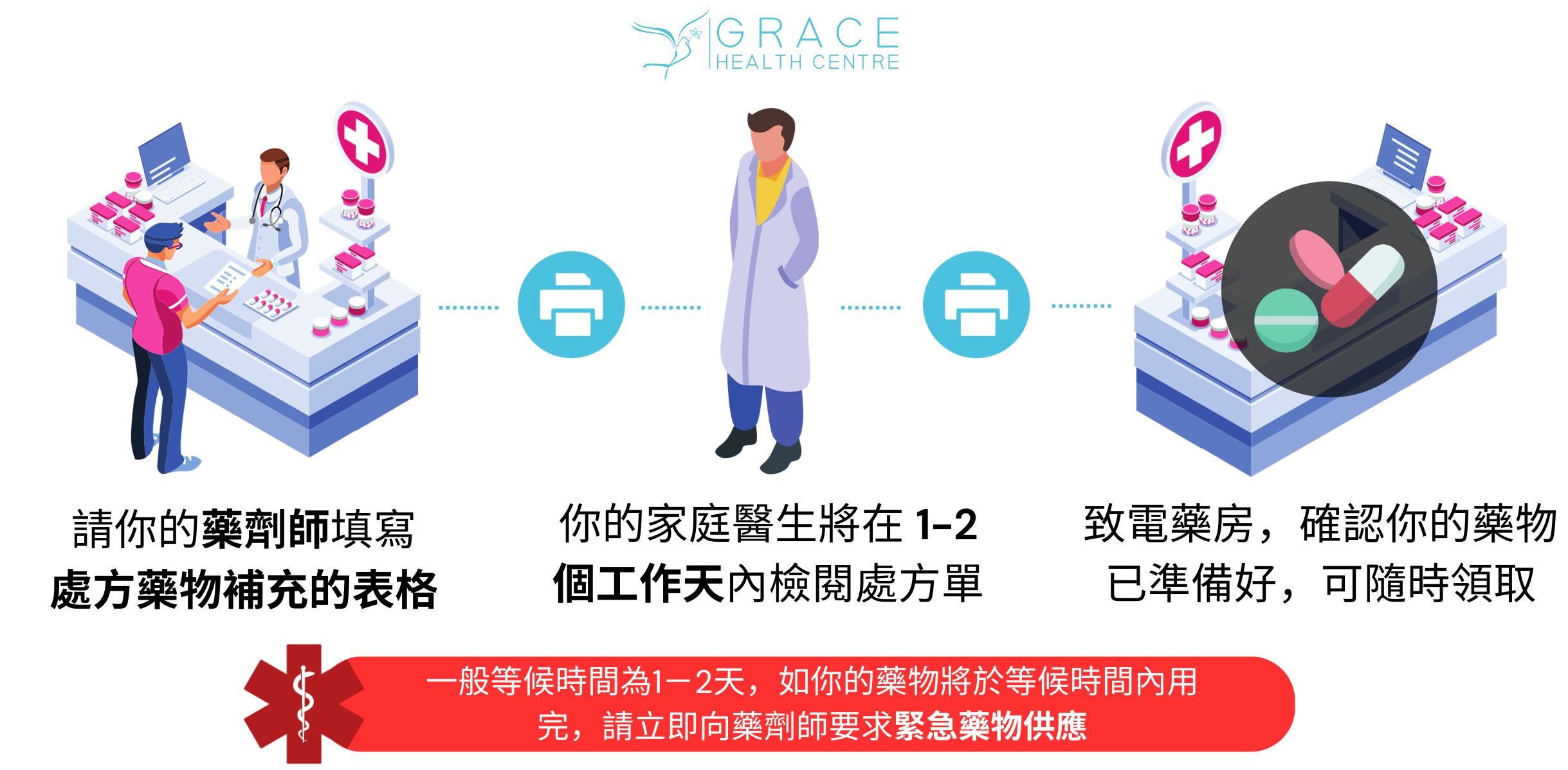 在大多數情況下,如果你需要續開已有的處方藥物,你不需要向醫生預約,只需要前往你的藥房並要求他們傳真處方續訂申請表格(prescription renewal request)給診所。藥房發送後,你的家庭醫生會在1-2個工作日內簽字批准並發還給藥房,你便可以在藥房領取你的藥物。對於緊急續方,你的藥劑師能夠在沒有醫生授權的情況下提供緊急的短期藥物供應。