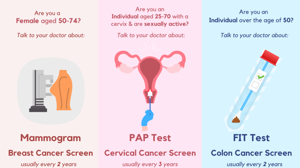Prevention and early detection of diseases are the best “cures” in the healthcare realm. Preventative care, such as regular cancer screening tests, can increase your lifespan because health concerns are more easily treated in earlier stages. Please book an appointment if you are due for one of these tests mentioned below.