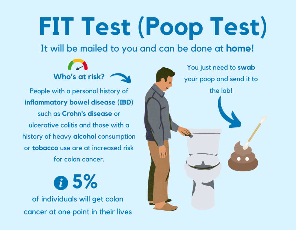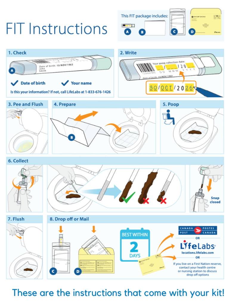 After booking an appointment with your family doctor at GHC, the FIT kit will be mailed to your house. The kit will come with all the necessary equipment – including clear instructions and sample tubes and swabs. To complete the FIT kit, a collection of your stool (poop) will be taken and sent to the lab.